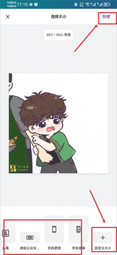 3、在相册中选择照片后,接着选择图片的大小,若下方大小不合适时,可以点击自定义大小,大小选择完成后点击创建即可。